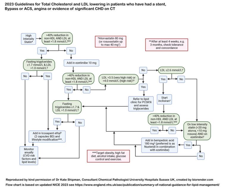If we consider personal risk in the first place, this is extremely difficult to assess, particularly for people yet to have an event. If you already have evidence of atherosclerosis, particularly severe or significant, it is easy to know your risk, i.e. it is high. Therefore for people after a heart attack, or stroke, or symptomatic with leg claudication or angina then the risk is very high and we would normally recommend aggressive risk modification. LDL/ApoB lowering can reverse the atherosclerosis, proportionately to how much lowering one achieves. This must be combined with modification of all other risk factors that can be identified, e.g. smoking cessation. See the figure below for a very simple schema suggesting how to approach lipid lowering escalation. It is important to note that decisions do not need to be this binary but it is an attempt to demonstrate the eligibility criteria for patients in England under NHS care.