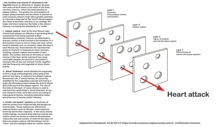 This concept is well illustrated by the Swiss Cheese Model of system accidents. The model describes a stack of spinning disks, each representing a layer of defence with holes. An accident, like a heart attack, occurs when these holes align, allowing hazards to reach victims. In heart disease, the ‘layers’ are biological processes affecting the coronary arteries. A heart attack happens when the ‘holes’ in at least four layers align by chance. Understanding this model helps us realise that heart attack prevention involves more than dealing with just one factor, such as by taking a statin.