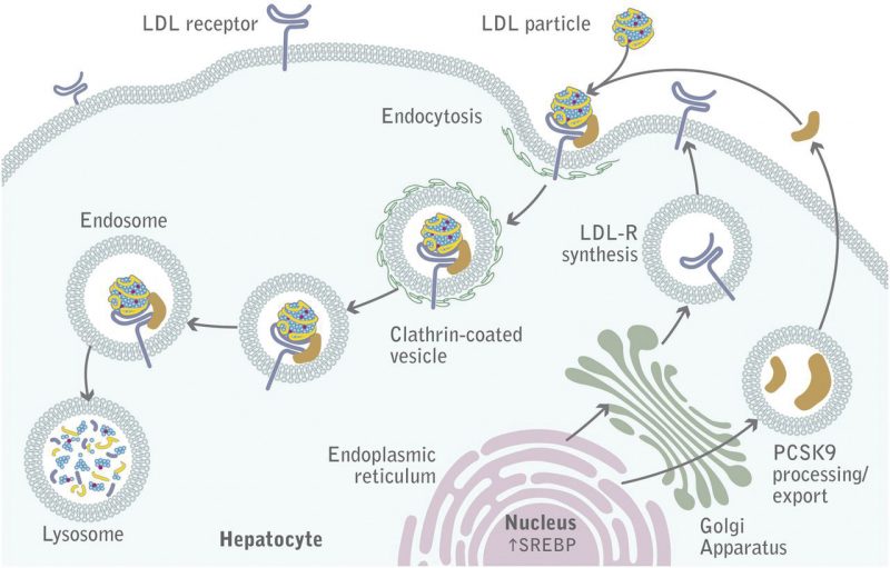 Under normal circumstances, LDL cholesterol is carried in the bloodstream until it reaches the liver cells, or hepatocytes. Here, LDL binds to LDL receptors on the hepatocytes, which then ingest and break down the LDL, effectively removing it from the bloodstream. PCSK9 is involved in this process as it binds to LDL receptors and promotes their degradation, reducing the liver’s capacity to clear LDL from the bloodstream. Therefore, high levels of PCSK9 mean fewer LDL receptors, less LDL uptake by the liver, and consequently higher LDL levels in the blood.