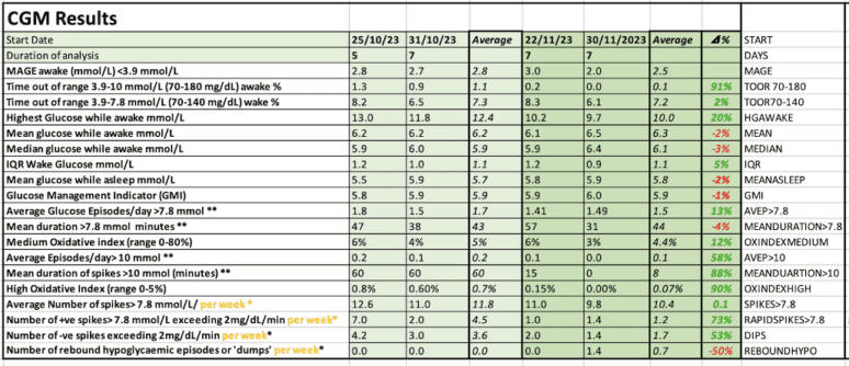 - Proportion of awake time where glucose exceeds 7.8 mmol/L or is below 3.9 mmol/L