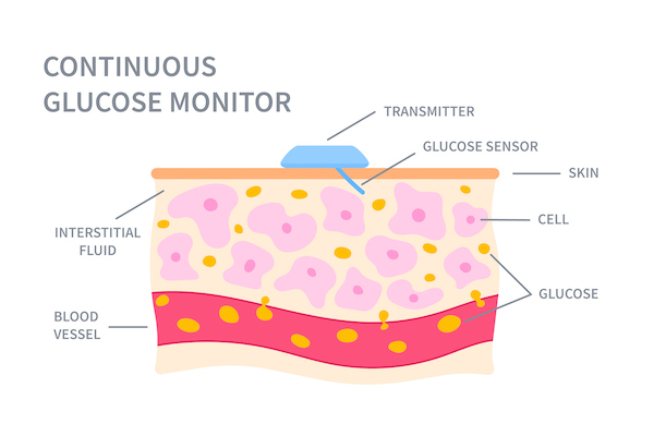 Continuous glucose sugar monitor. Glucometer wireless transmitter. CGM device on patient’s skin. Measurement of blood glucose level. Vector illustration.