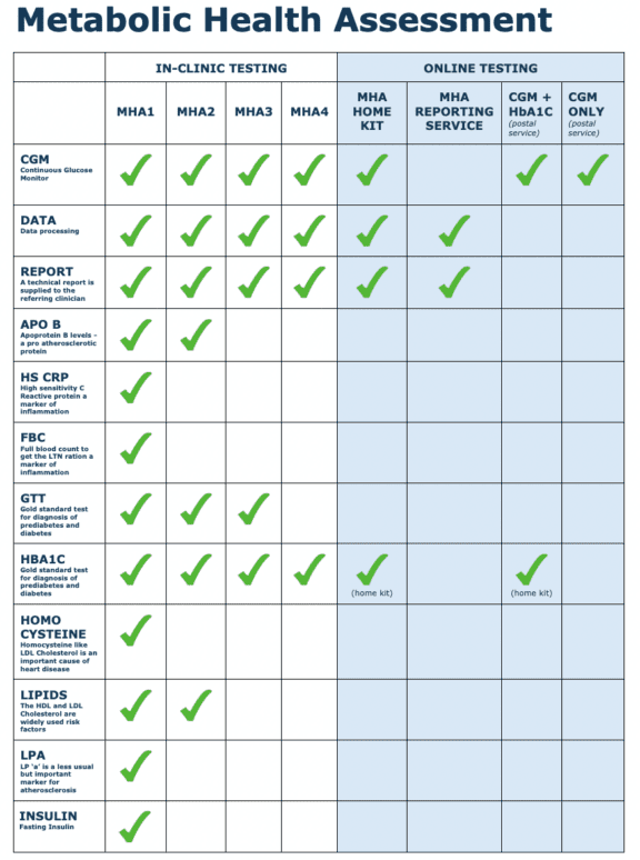 Our Metabolic Health Assessment provides a comprehensive review of an individual patient’s metabolism including lipoproteins, glucose variability, spikes and traditional measures of inflammation and glucose homeostasis. Where glucose dysregulation is detected, we must remember that at present there is no hard evidence that flattening glucose curves or reducing glucose spikes has a significant impact on long term health, and historic negative interventional studies warn against over enthusiastic intervention. There is good circumstantial evidence that glucose spikes have detrimental effects, so in those affected, dietary intervention, under the direction of a a qualified Dietitian or Nutritional therapist, seems a sensible next step for early adopters.