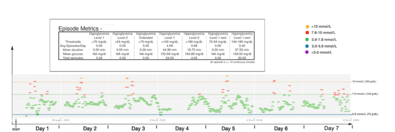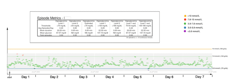 Although the patient had a normal HbA1C and is defined as ‘non diabetic’, his continuous glucose monitor results shown above revealed multiple glucose excursions over 7.8 and 10 mmol/L, dramatically different from the profile typically seen in a healthy patient without heart disease with the same HbA1c (illustrated below for comparison).
