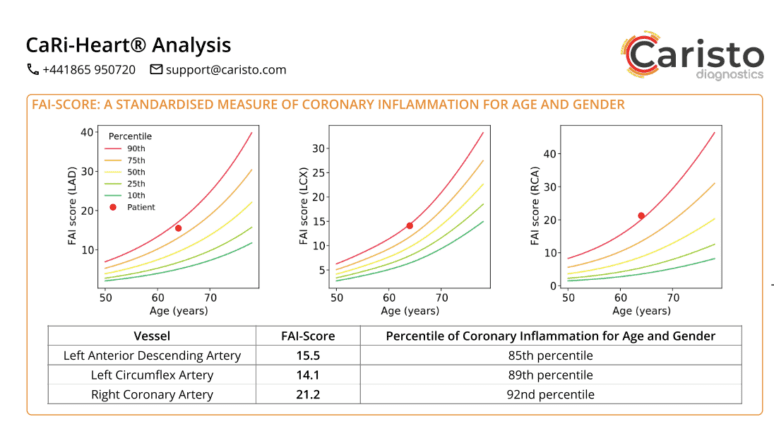 - Fat Attenuation Index (FAI) – A recent innovation from the Oxford Group and Caristo, this technology provides insights into active coronary inflammation, offering a clearer signal of patients at high risk of a first coronary event.