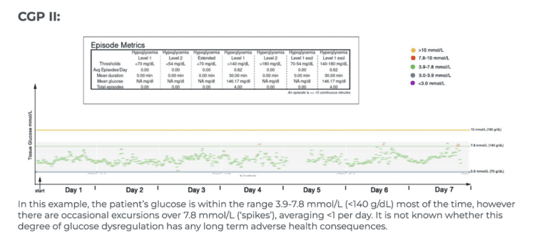 To aid patients in navigating their CGM results, it’s helpful to see examples of different glucose patterns. To act as a guide here are 5 examples of glucose monitor results presented in a standardised graphical format- where the glucose levels that are believed to be important are shown as coloured lines, the implication being that the ideal profile and CGP might be where glucose values excursions fall below the green line (7.8 mmol/L) with values over 7.8 mmol/L shown in red and values over 10 mmol/L shown in amber. In these time/glucose plots, individual glucose measurements are shown as coloured dots- healthy values depicted by green dots and high values in red or amber.