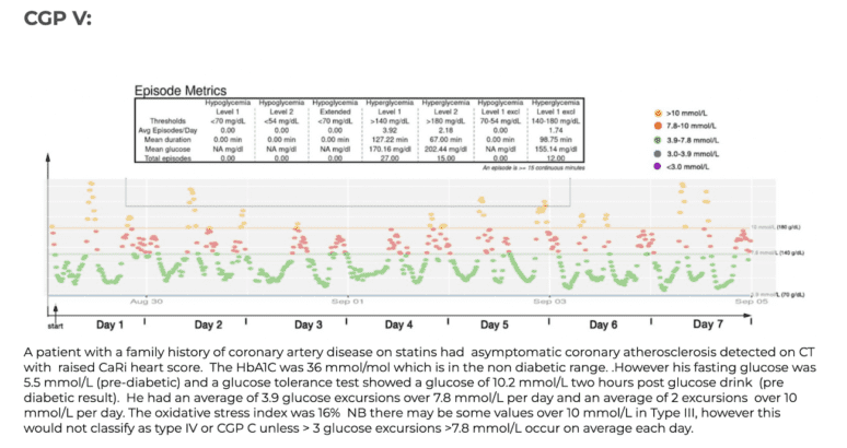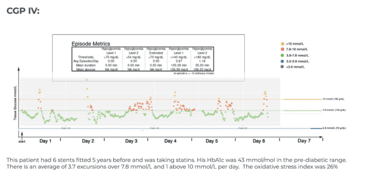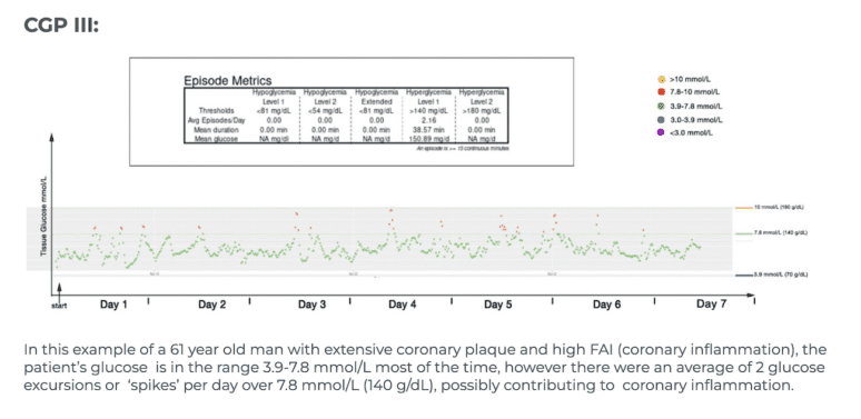 While awaiting more definitive trials, it’s valuable to observe and analyse the range of CGM results seen in various patient groups. In some individuals, a relatively narrow glucose range—typically between 3.9 and 7.8 mmol/L (72 to 140 mg/dL)—is seen. This range seems to indicate healthy responses to foods, including those high in glycaemic index. We observed non diabetic patients with either early or advanced coronary heart disease often have glucose spikes exceeding 7.8 mmol/L, potentially presenting a different metabolic health profile that requires closer medical attention. For those patients with coronary artery disease or raised coronary fat attenuation index, it raises the intriguing possibility that these glucose spikes and/ or high glucose variability may be contributing to their coronary inflammation. Due to widespread use of CGMs in lifestyle apps such as Zoe and Veri there are many reports that people with glucose spikes on CGM in response to food intake can lose significant amounts of body fat, by altering their food intake to minimise glucose spikes. However the long term effectiveness of CGM-guided food choices has yet to be confirmed.