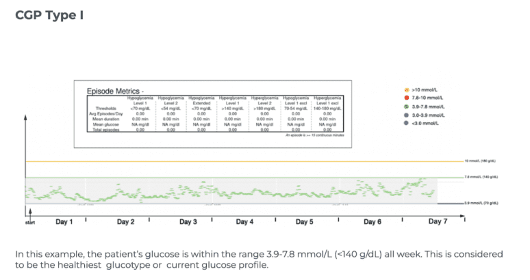 Until we see long term trials to justify more definite answers to this question, we simply cannot know for sure, however it is known that there is an optimum BMI range – below and above which health issues are more likely to arise, and we also have evolving data suggesting that glucose variability and glycaemic responses exceeding 7.8 mmol / lit are unhealthy, so it seems reasonable to assume that the healthiest glycotype/ subtype is GT1 (ie flat glucose curve ) and the best CGP to shoot for is CGPI-B or CGPII-B – where the BMI and THR are within a healthy range and CGM measurements show glucose excursions between 3.9 and 7.8 mmol/L, with infrequent glucose values exceeding 7.8 mmol/L per day and none over 10 mmol/L.