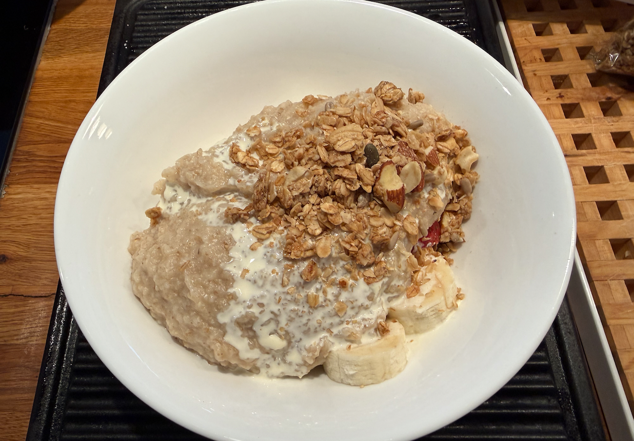 Porridge frequently becomes a vehicle for carbohydrate layering — banana, honey, dried fruit, sweetened milk. What begins as a fibre-rich breakfast can quickly become a substantial glycaemic load.