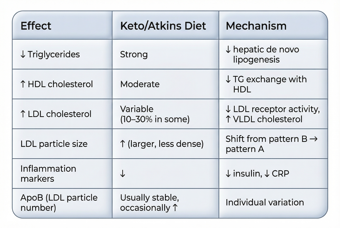 - Keto and Atkins diets lower triglycerides and improve HDL, but may raise LDL cholesterol in certain individuals by reducing LDL receptor activity and increasing hepatic cholesterol export.
