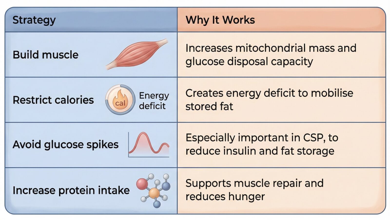 Skeletal muscle isn’t just for movement — it is your glucose sink. It burns energy, supports metabolism, and prevents excess insulin release. To reduce VAT, you must: